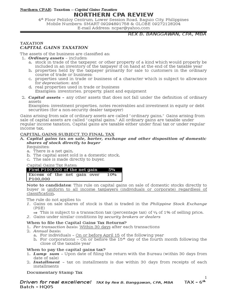 Capital gains taxes. Computation of Capital Gains Tax in the Philippines.